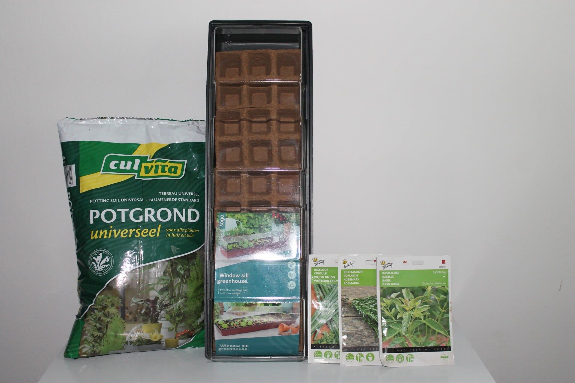 Inhoud: 3 zakjes kruidenzaad (bieslook, rozemarijn, basilicum), kweekbak voor binnen, Cultiva potgrond 5 L.
