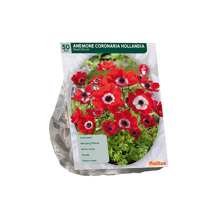 Anemoon Hollandia is een bekend soort. De bloemen lijken op die van de klaproos. Ook heeft de Hollandia een lange bloeiperiode; van mei tot oktober. De Anemoon kan een hoogte van 40 cm bereiken. Geef ze bij voorkeur een plek in de zon, in goed waterdoorlatende grond. Anemoon Hollandia kan ook als snijbloem gebruikt worden. Planten en kopen van de Anemoon Hollandia kan jaarrond. De verpakking heeft een inhoud van 50 bollen.