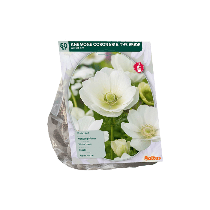 Anemoon The Bride bloeit van april tot oktober met witte bloemen. Deze bloemen zijn groot en enkelvoudig. Ze bewegen al bij een zuchtje wind en worden daarom ook wel windbloemen genoemd. De bloeihoogte is ongeveer 40 cm. Anemoon staat graag in de zon of half schaduw en in goed doorlatende grond. Het kopen en planten van de bollen kan het hele jaar door. De verpakking Anemoon The Bride heeft een inhoud van 50 bollen.