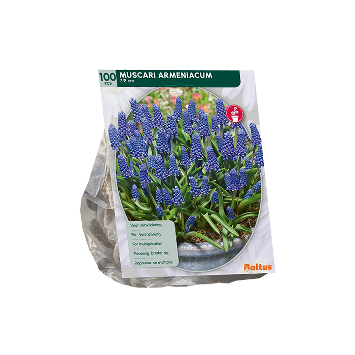 Muscari Armeniacum, oftewel het bekende Blauwe druifje, bloeit in maart en april met blauwe trosjes. De hoogte van de blauwe druif is zo’n 20 cm. Het is een makkelijke plant die overal goed gedijt. De blauwe druif zal zelfs elk jaar mooier en voller bloeien. Toepassen van de muscari kan in een pot op terras of balkon, in het gazon of in een border. Het kopen van Muscari Armeniacum bloembollen kan van september tot en met december. Dit is gelijk een geschikte periode om de bollen te poten. De verpakking heeft een inhoud van 100 bollen.