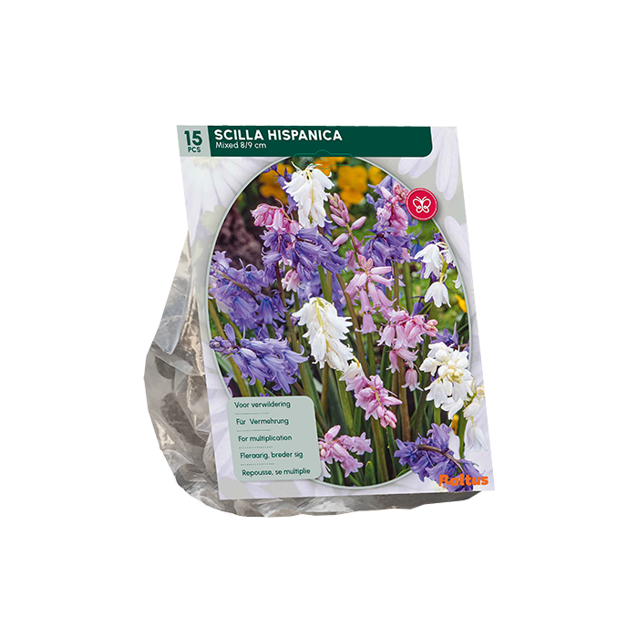 De Scilla Hiscpanica, ofwel boshyacint, is een plant die graag half in de schaduw staat. Van april tot juni bloeit deze boshyacint in een mix van de kleuren wit, roze en blauw. Deze groeien in een tros aan een stengel van ongeveer 25 cm. De bloemetjes zijn net hangende klokjes. Boshyacint bollen poten en kopen kan van september tot en met december. De inhoud van deze zak is 15 bollen.