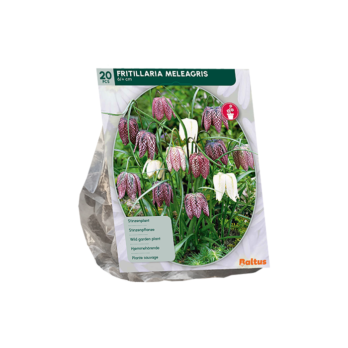 Fritillaria Meleagris wordt ook wel kievitsbloem genoemd. Dit, omdat de plant in het wild de voorkeur geeft aan vochtige weidegrond. Plant de bollen dan ook bij voorkeur in een wat vochtige bodem. De Meleagris bloeit in maart en april met hangende bloemen in de kleuren paars en wit. De bloemen hebben een schaakbord-achtig patroon. Planten en kopen van de bollen kan van september tot december. De verpakking heeft een inhoud van 20 Fritillaria Meleagris bloembollen.