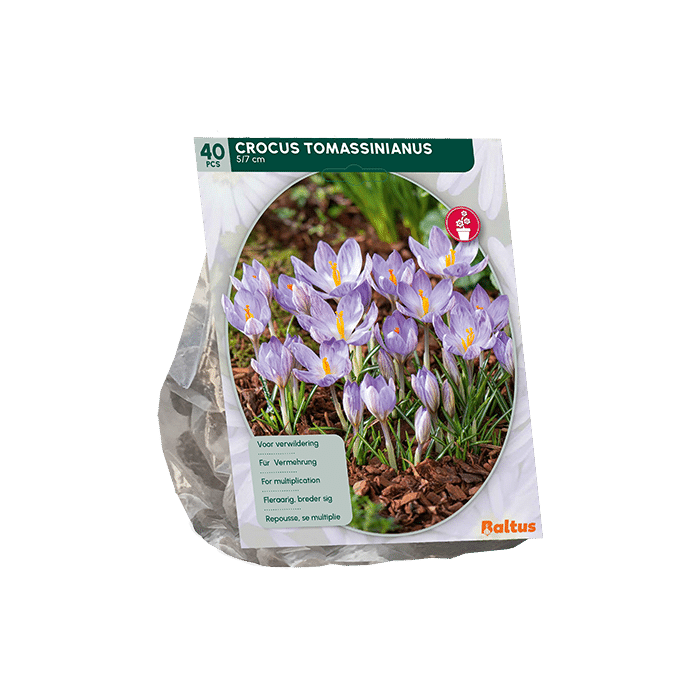 De crocus Tomassinianus hoort bij de botanische krokussen. Deze krokus bloeit vroeg in het voorjaar van februari tot april. De kleine bloemen zijn lila/paars van kleur met een wit hart. Het blad van de krokus lijken net grassprieten. Krokus Tomassinianus leent zich goed voor verwildering en vermeerdering. Krokus bollen kopen en planten kan van september tot en met december. De verpakking Crocus Tomassinianus heeft een verpakkingseenheid van 40 bollen.