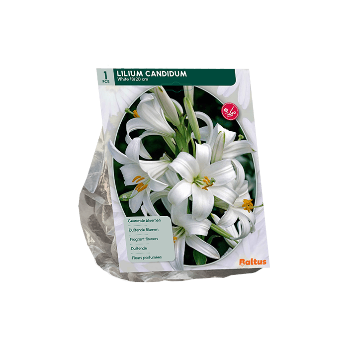 Lilium Candidum wordt ook wel madonnalelie genoemd. Deze bloeit van mei tot juli met lange trompetvormige bloemen. De bloemen zijn wit en verspreiden een zoete geur. De bloeihoogte is ruim 100 cm hoog. Lelie candidum houdt van een lichte plek, maar niet van de volle zon. Plant ze niet te diep, in een vruchtbare en goed gedraineerde grond. Zo kunnen ze jaren de tuin sieren. Lilium candidum poten kan van september tot en met december. Dit is gelijk de periode waarin de lelie te kopen is. De verpakking bevat 1 bol.