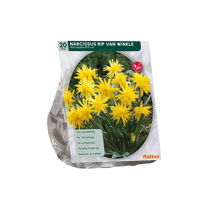 Narcis mini Rip van Winkle heeft bijzondere, gele bloemen. De narcis bloeit van maart tot mei en wordt ongeveer 20 cm hoog. Na de winter brengt de narcis als een van de eerste weer kleur en leven in de tuin. Geef de bollen een mooie plek in het gazon of in een pot op balkon of terras. Het liefst staat de narcis in de volle zon. Het poten en kopen van de bollen kan alleen van september tot en met december. Deze zak bevat 20 bollen.